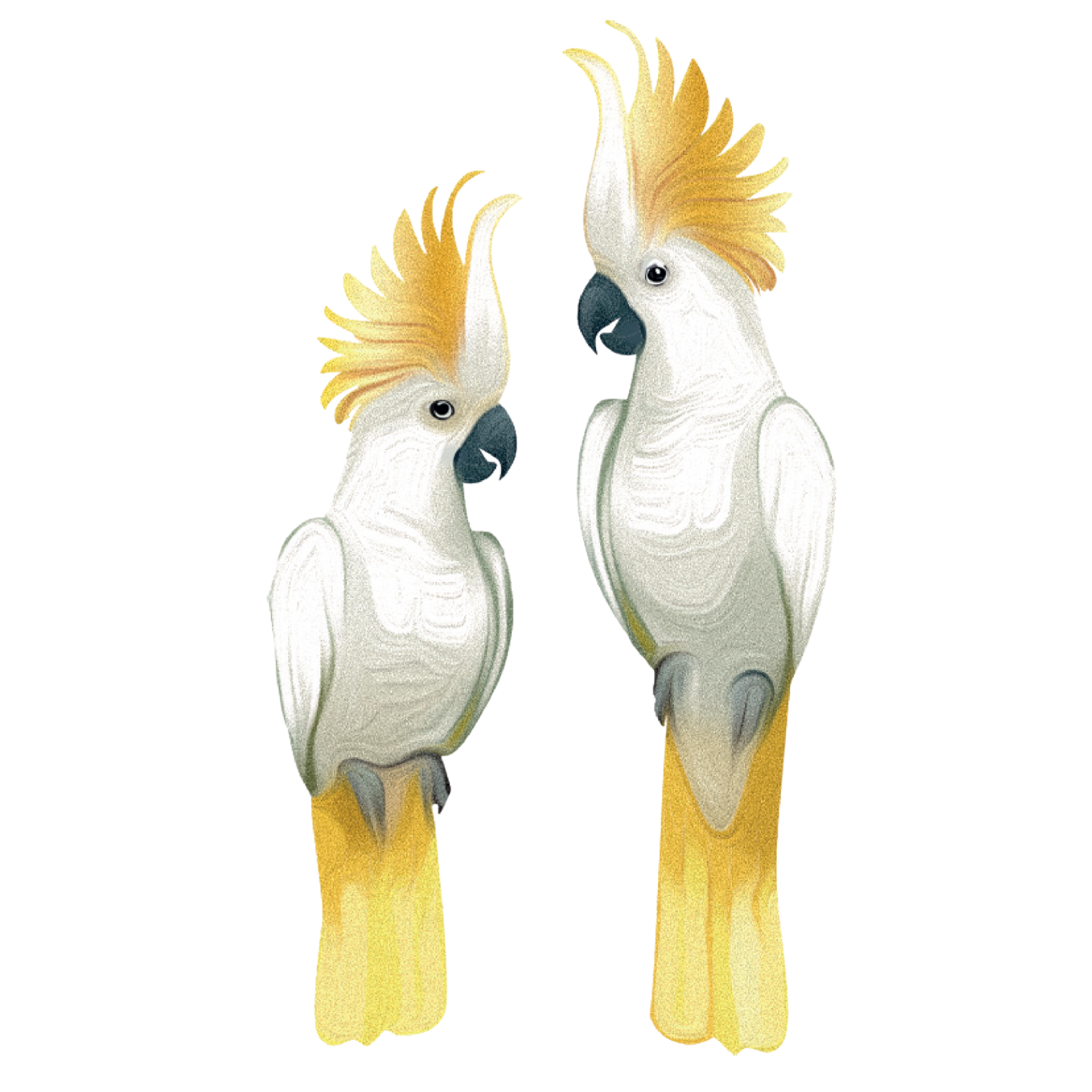 A tale of two cockatoos deeply in love, soaring across the lush Caribbean islands and leaving trails of bliss in their flight.